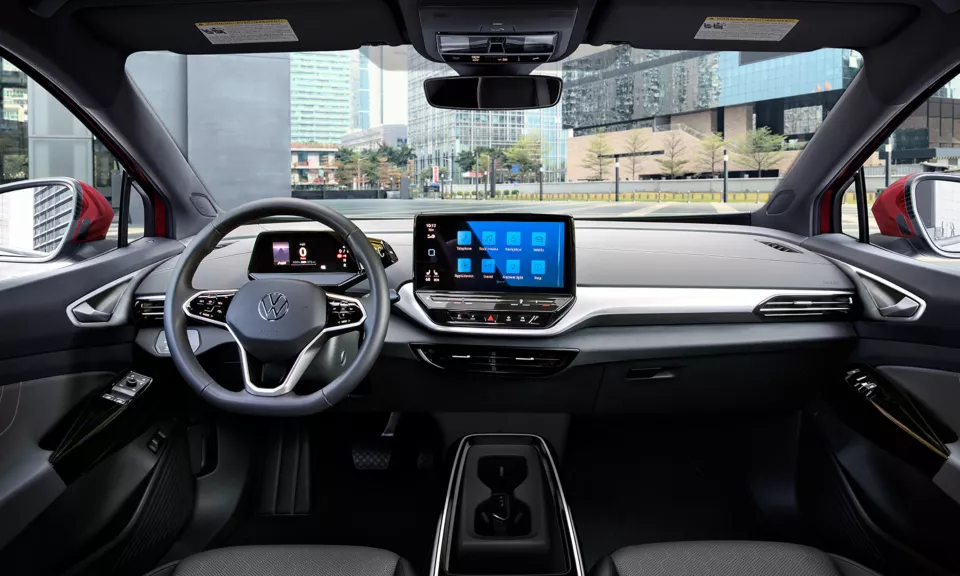 The interior of ID.4 mirrors the futuristic look of the exterior, with functionality almost completely controlled by touch or voice control. The ID.Cockpit display in front of the driver is operated with touch-sensitive controls on the multifunction steering wheel which provide haptic feedback. Up to three tiles show the most important information, with the display for battery status and range underneath. A control panel to the left of the steering wheel integrates the lighting functions, including the automatic headlights and defrosters.